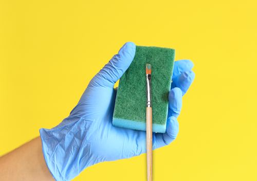 ทำความสะอาดพู่กัน: ใช้ฟองน้ำชุบน้ำทำความสะอาดพู่กันหลังใช้งาน